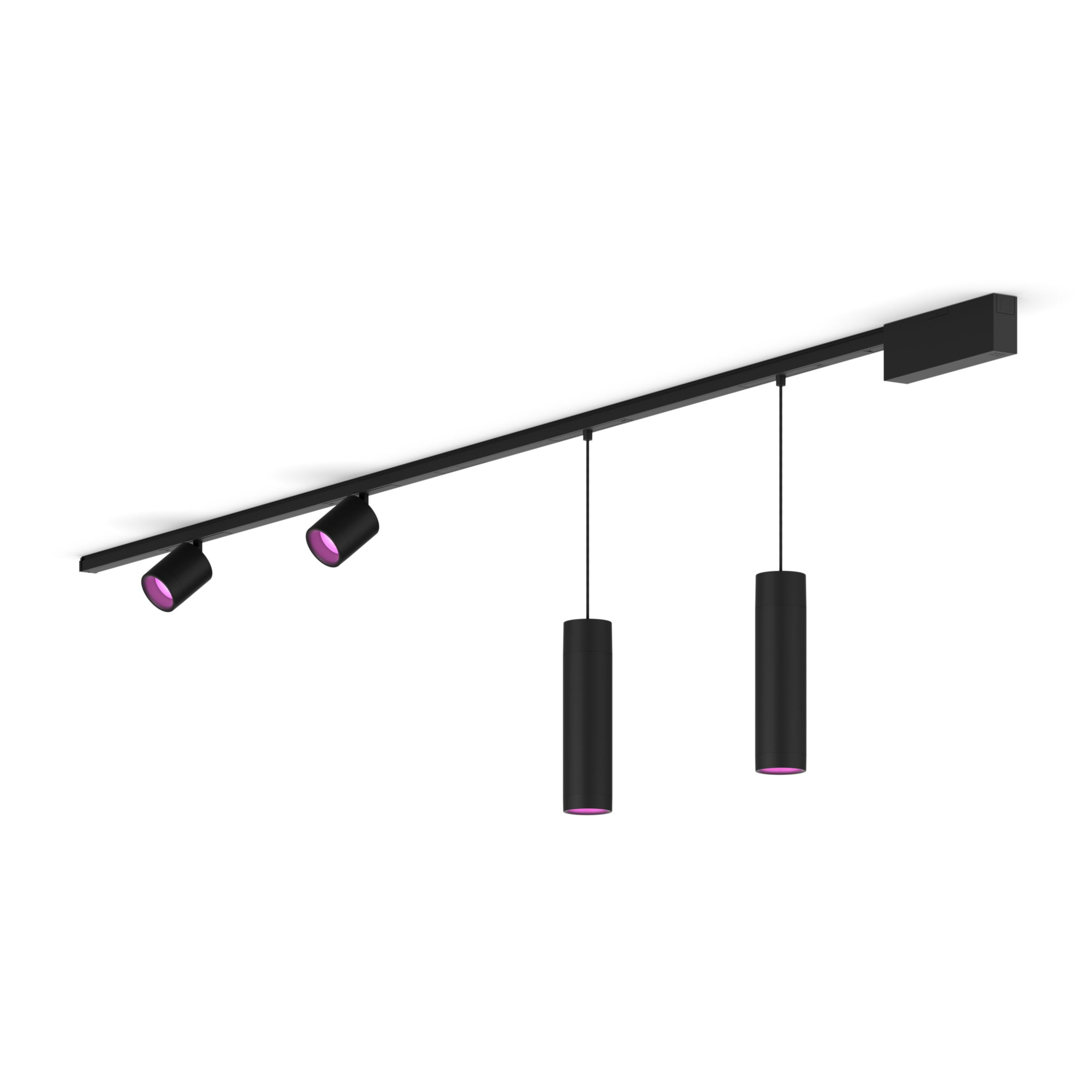 This ceiling Perifo Category kit in black includes two cylinder spotlights, two pendant lights, two 1-meter rails, a PSU that sits at the end of one rail, and connectors to create a straight line.