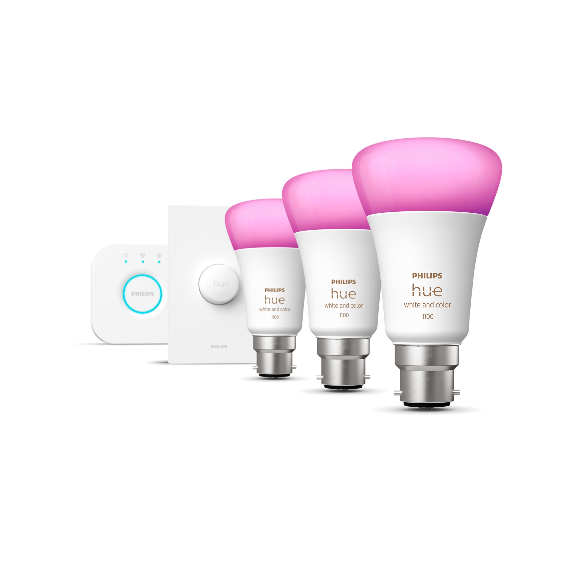 Add ambient color to any room with the Philips Hue White and color ambiance B22 starter kit. Connect to the included Hue Bridge to take advantage of endless list of features. Control via the App, voice or the included Smart Buttons.
