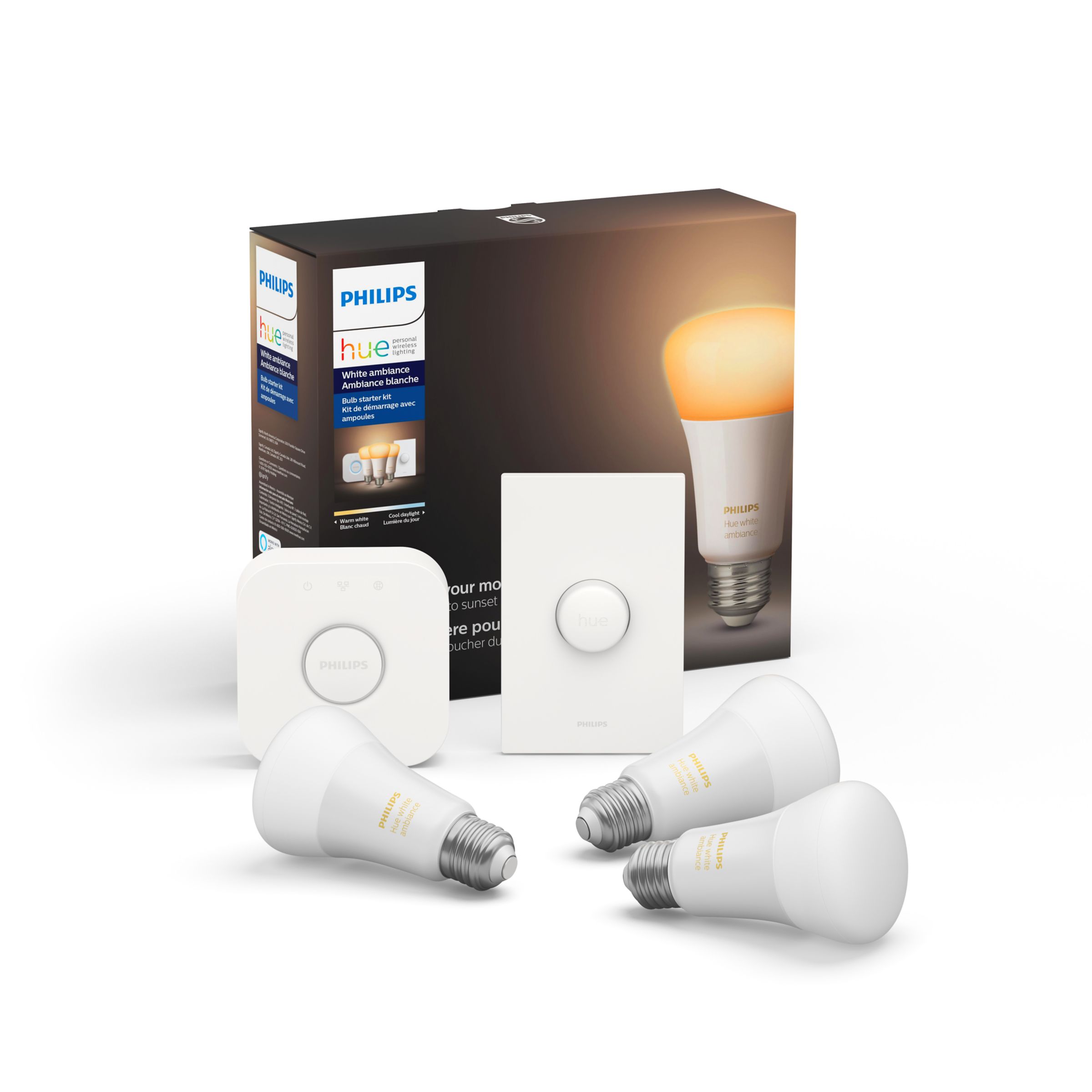 Enjoy relaxing and energizing scenes or create your own routines right out of the box with the Hue White ambiance bulb starter kit. Includes Hue Bridge, 3 smart bulbs that offer the full spectrum of white light and a Smart Button. As bright as a 60 W bulb.